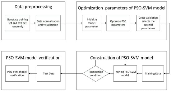 Combination of the PSO algorithm and SVM model can effectively solve this problem. We use the PSO algorithm to optimize the parameters in this paper. Because the algorithm is easy to understand, the realization is simple, the adjustable parameters are few, and it is better than common intelligent algorithms like artificial neural network (ANN) and Genetic algorithm (GA) in many cases. Based on the previous discussion, taking the Gaussian Radial Basis Function (RBF) function as the kernel function, we demonstrate the flowchart of the PSO-SVM algorithm in Figure 1. As Figure 1 shows, The PSO-SVM process can be stated as the following steps: (1) Data to preliminary processing. This optimization method needs a training process based on the known data set to obtain the SVM model. Thus, we should generate the training set and test set randomly, while the data should be normalized and dimensioned; (2) initialize parameters of particle swarm optimization like population size, the maximum iteration number, and so on. Of course, also its parameters C and g are included; (3) particle swarm optimization is adopted to search the optimal solution of particles in global space by using a cross-validation algorithm; (4) put the training data into the SVM model with the optimal parameters to obtain the trained PSO-SVM model; and (5) the testing data is used to test the prediction ability of the trained PSO-SVM model.