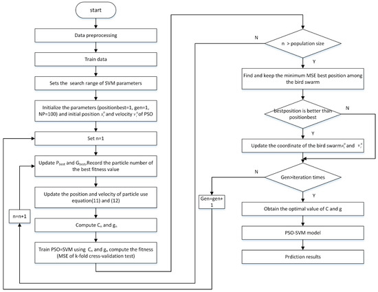When gen is equal to the maximum iteration number, and the stop criterion is met, the optimal parameters of the SVM model are finally obtained. Otherwise, it is necessary to go back to Step 2. Then, end the training and verification procedure and get the result of the PSO-SVM model. The diagram of the SVM-PSO forecasting model is illustrated in Figure 2.