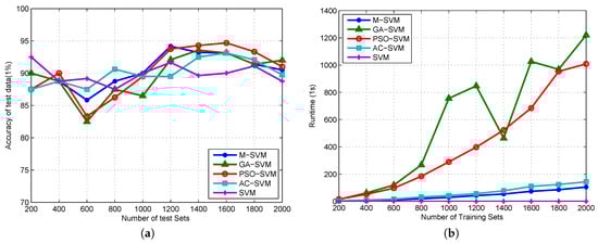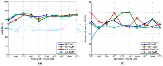 The prediction accuracy fluctuates greatly when the number of samples is small. The accuracy rate reaches the lowest point when the number of samples is 600, with the increase in the number of samples, the accuracy rate increases, the accuracy based on M-SVM reaches the maximum when the number of samples is 1200, and then the accuracy rate begins to decline. The GA-SVM model reaches the maximum when the number of samples is 1400, and then the accuracy rate begins to decline. The AC-SVM model gets the best classification accuracy when the number of samples is 800, but then it has poor performance. The accuracy based on the PSO optimization method achieves the maximum value when the number of samples is 1600, and the accuracy is basically better than the GA method. We just used the SVM method and the training set established a model without optimization of the parameter selection. The accuracy of the test data based on this SVM model is shown in Figure 4. With reference to SVM, the GA-SVM and PSO-SVM models are more accurate when the number of samples is large.