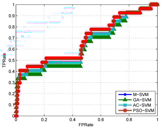 In order to further analyze the performance problem of PSO-SVM based on the Particle Swarm Optimization algorithm and the algorithms based on bionic intelligence GA-SVM and AC-SVM, we use the data set whose sample size is 1000 as an example, and the generalization ability of these four algorithms is shown in Figure 5. In Figure 5, the abscissa is the FPRate (False positive rate) and the ordinate is the TPRate (true positive rate). The curve in Figure 5 is the ROC (Receiver Operating Characteristic) curve drawn from the wired sample. The two learners are judged by comparing the area under the curve, that is, the AUC (Area Under Curve). Secondly, we use MSE (Mean Square Error) to evaluate the stability of the four methods. It can be seen from the experimental results in Table 2 that the four methods are different for different samples of MSE, but on the whole, the SVM model parameters are selected by using the Particle Swarm Optimization algorithm, which is much more stable than the Genetic algorithm and the Ant Colony algorithm. With small samples, the accuracy of the PSO-SVM method and the GA-SVM method are considerable, but the PSO-SVM is more efficient, and, with the increase in the number of samples, PSO-SVM will be more stable and efficient. Compared with AC-SVM, PSO-SVM has higher classification accuracy; however, the computation time of the PSO-SVM model is slightly longer with the large data set. These four algorithms are better for large data classification. It can be seen from Table 2 and Figure 4 and Figure 5 that the SVM based on Particle Swarm Optimization algorithm has better learning performance. Experiments show that SVM model parameter selection based on the Particle Swarm Optimization is effective and feasible.