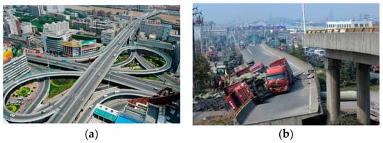 Perspective view and collapse of irregularly-shaped bridges. (a) Xiao Xihu overpass in Lanzhou; (b) collapsed overpass in Zhejiang [].