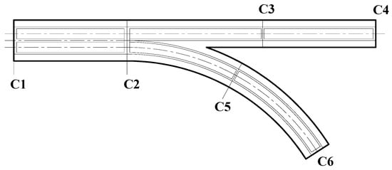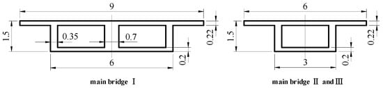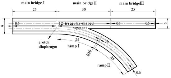 A typical irregularly-shaped pre-stressed concrete continuous box girder bridge, as shown in Figure 2, is selected as the research object [,]. This bridge consists of a straight three-span continuous girder (main bridge), and a curved two-span continuous girder (ramp), which are widely used in irregularly-shaped thin-wall box girder bridges. The spans of the main bridge are 25 m + 30 m + 25 m, and the distance from the bifurcation position to the left side of the main bridge is 25 m. The first span of the main bridge is a single-box double-room girder with a constant section of 9 m in width. The other spans of the main bridge are a single-box single-room girder with a constant section of 6 m in width. The cross-section of the ramp is the same as the second span of the main bridge, which is shown in Figure 3. The ramp radius is  m, and spans are 25 m + 25 m. The diaphragm beams are set at the bearing position of each span. The width of the diaphragm beam at the bifurcation position is 1.2 m, and the others are 0.6 m. The bridge is composed of C50 concrete, and the material parameters are modulus of elasticity , modulus of shear , density  and Poisson ratio . The bearing positions of the typical irregularly-shaped bridge are shown in Figure 4. The corresponding bearing conditions are listed in Table 1.
