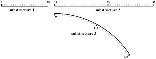As an important component of substructure methods, the dynamic substructure method can take advantage of the modal characteristics of each subsystem with a simple calculation process to finally obtain the modal characteristics of the whole structure. Since the 1960s, the dynamic substructure method has been developing rapidly []. Especially in recent years, this method has been increasingly applied in the field of Bridges. Biondi et al. [] presented a substructure approach for analyzing the dynamic response of the train–rails–bridge system. It regards the train, rail, and bridge deck as three substructures, and simultaneously computes the dynamic responses of the train, rail, and bridge to analyze vehicle–bridge dynamic interaction. Li et al. [] proposed the damage identification strategy based on the dynamic substructure method, which divided the complex structure into several substructures, and identified the structural damage based on the dynamic response of the substructures under moving load excitation. Kong et al. [] demonstrated a new substructure approach to analyzing the vehicle-induced vibration of long-span hybrid cable-stayed bridges. It divided the bridge into many substructures with a reasonable length and condensed the substructures model in detail with refined mesh into super elements. It used the dynamic substructure mode synthesis method to analyze the vehicle-induced dynamic response under deterministic flows.