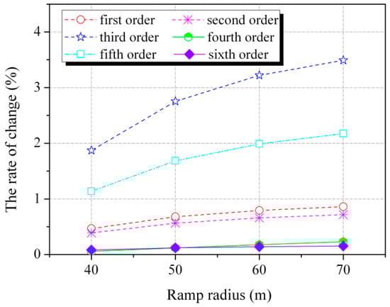 The change rates of modal frequencies of the irregularly-shaped bridge with different ramp radii with respect to that of radius 30 m are shown in Figure 6. As can be seen from the results, modal frequencies of vertical bending mode increase with ramp radii. The change rates of the third and fifth modal frequencies are obvious, while the others are relatively small. As for the mode shapes, vertical bending of the ramp is the main vibration style in the third and fifth modes (shown in Figure 7), while vertical bending of the main bridge is obvious in other modes. Therefore, the effects of ramp radii are more significant in the third and fifth modes, which are coincident with the change of modal frequencies.