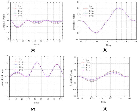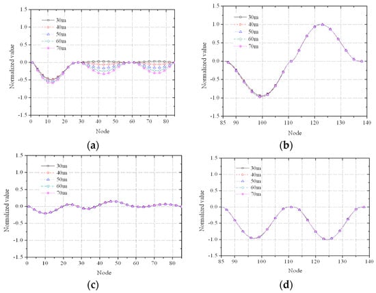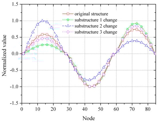 The relationships between the cross-section stiffness of the substructures and the first mode shape of the main bridge are shown in Figure 12. Significant change of mode shape has occurred, which indicates that mode shapes have nothing to do with the cross-section stiffness of the whole bridge, but their relative distribution.
