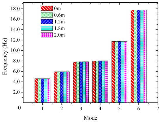 The design parameters of substructures 2 and 3 remain unchanged, while the stiffness of the crotch’s diaphragm is varied by adjusting its width in substructure 1. The modal characteristics are calculated with the widths of 0 m, 0.6 m, 1.2 m, 1.8 m and 2 m, respectively. The first six modal frequencies of vertical bending modes are shown in Figure 8.