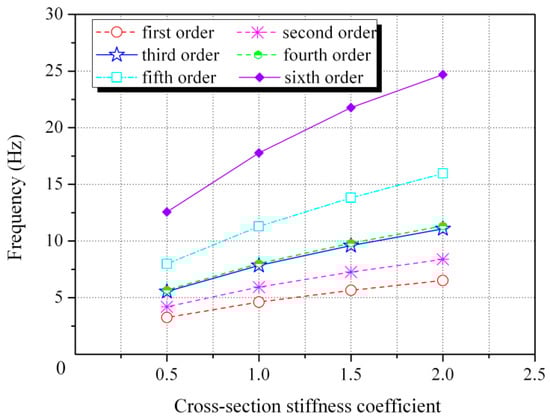 As can be seen from Figure 10, modal frequencies increase with the growth of the cross-section stiffness. The cross-section stiffness has a significant effect on the modal frequencies of the whole structure. The fundamental frequency increases by 41.42% while the stiffness increases to two times the original value. However, the change of stiffness has little effect on mode shapes.