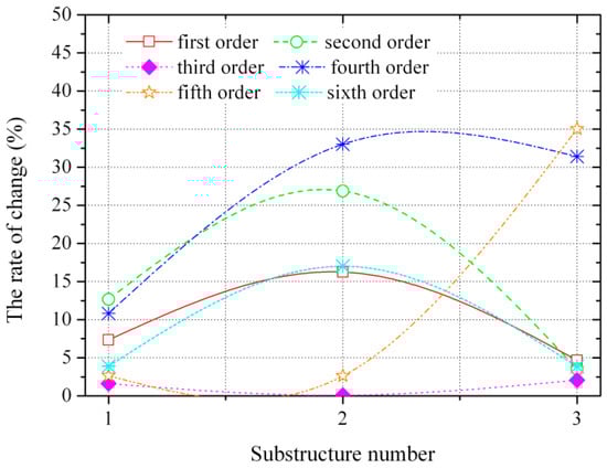 Change rates of the first six modal frequencies with the cross-section stiffness of the substructure.