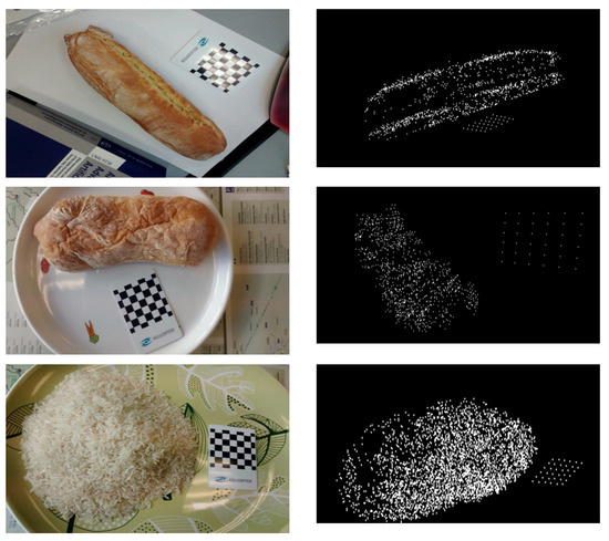 Finally, outliers are removed from the point-cloud. Since the ground surface has been determined based on the checkerboard location, it is possible to apply restrictions to the maximum acceptable height of the food item (we set such limit to 20 cm). The point-cloud usually also includes isolated outliers that are relevantly far from the other points. To deal with this problem, we remove from the point-cloud the points whose distance from the closest neighbor is larger than a threshold. In practice, for each point, four types of distances are defined: the Euclidean distance and the distances along the three coordinate axes. Acceptable points should be no farther from their nearest neighbor than one standard deviation for each of the measures taken into consideration.