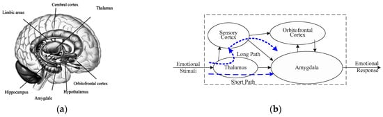 The description of the emotional brain is based on the limbic system theory []. Figure 1a [] shows the limbic system in the emotional brain and its components, including the sensory cortex, thalamus, amygdala, orbitofrontal cortex, etc. There are two main parts among these components. One is amygdale, which plays a critical role in emotional learning and reacting. The other is orbitofrontal cortex, which assists amygdala to process emotional stimulus. LeDoux [] argues that emotional stimuli can reach the amygdala by two different ways, as shown is Figure 1b. One is short and fast, coming directly from the thalamus, and the other is long and slow, coming from the sensory cortex. Amygdala is properly situated to reach the stimuli extremely quickly and produce the required reaction. Due to the existence of a short path in the emotional brain, emotional stimuli are processed much faster than normal stimuli.