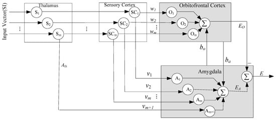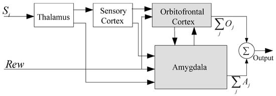 Motivated by LeDoux’s anatomical findings in the emotional brain, Morén et al. [] proposed the amygdala-orbitofrontal model in 2000, the framework of amygdala-orbitofrontal model is shown in Figure 2. The structure is inherited from some parts of the limbic system (e.g., the amygdala, thalamus, sensory cortex) and imitates the interaction between those parts of the limbic system. In the amygdala-orbitofrontal model, amygdala and orbitofrontal cortex are essential for emotional learning and reacting. Amygdala receives emotional stimuli from the sensory cortex and thalamus, as well as the external reward signal, and it interacts with the orbitofrontal cortex and reacts to the emotional stimuli based on the reward signal. The orbitofrontal cortex receives sensory input from the sensory cortex, as well, and evaluates the amygdala’s response to prevent inappropriate learning connections. They interact frequently to mimic the functionality of the emotional brain responsible for processing emotional stimulus.
