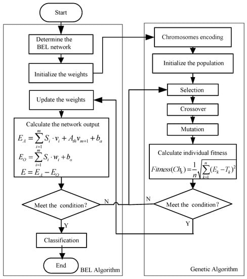● Step 3: Classification. After the operations of selection, crossover and mutation, the best chromosome can be found that represents the best weights. The original weights and biases are reassigned by the best chromosome, and the trained network is used to classify. The iterative process can be terminated when the result reaches a defined condition. The flowchart of the GA-BEL algorithm is given in Figure 5.