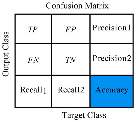 where TP is the number of true positives, FN is the number of false negatives, TN is the number of true negatives and FP is the number of false positives. The accuracy, recall and precision are calculated by the following formulas: