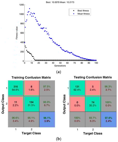 Figure 7a shows the best and mean fitness corresponding to each generation during the evolution. It can be observed that the fitness curves gradually improved from Generation 1–100 and exhibits no significant improvements after Iteration 90, eventually stopping at Generation 100. This phenomenon demonstrates that GA-BEL comes to convergence and obtains the best chromosome by the evolution.