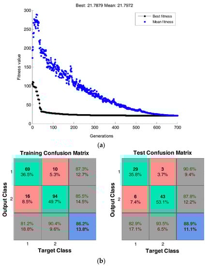 Figure 8a shows the best and mean fitness corresponding to each generation during the evolution. It can be observed that the fitness curves gradually improved from Generation 1–700 and exhibits no significant improvements after Iteration 600, eventually stopping at Generation 700. This phenomenon demonstrates that GA-BEL comes to convergence after 700 generations and obtains the best chromosome by the evolution.