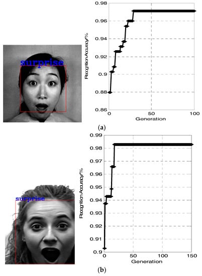 As shown in Figure 9a, the accuracy is stable after 30 generations, and the classification accuracy is 97.19%. Figure 9b shows that the accuracy is stable after 18 generations, and the classification accuracy is 98.32%. However, there are still some difficulties that occur on the classification of the sadness and fear expressions. The results of correctly-classified and misclassified expressions are shown in Figure 10.