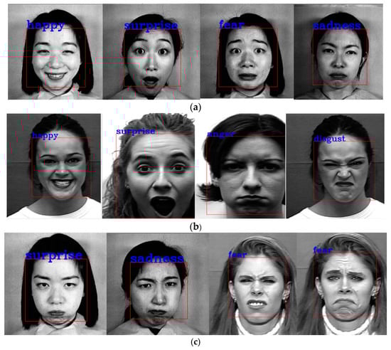 Facial expressions recognition results. (a) Correctly-classified expression on the JAFEE database; (b) correctly-classified expression on the Cohn–Kanade database; (c) misclassified expressions; the true expressions are angry, angry, disgust and sadness in turn.