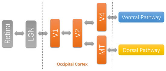 15]. The stream (V1→ V2→ V4) to the ventral pathway is critical for object discrimination, and the stream (V1→ V2→ MT) to the dorsal pathway is functionally related to visual motion [