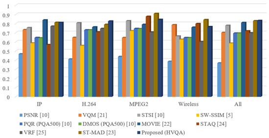 Figure 3 shows the performance comparison between these metrics as bar charts. For three of the four distortion types, the proposed metric performs in the top three. For the IP distortion types, HVQA performs the best in the comparison metrics. For the wireless and MPEG2 distortion, HVQA performs the third best and is competitive with the best. For the MPEG2 distortion, the proposed HVQA metric is also competitive with the top three metrics. However, some of the comparison metrics show high performance on only one type of distortion. For example, VQM on MPEG2 type, STSI on IP type, and MOVIE on wireless type; each of them has a high performance on the correspondence distortion type, but do not perform well on the other types. Thus, the HVQA metric is rather robust to various types of video distortion. It is observed that the HVQA metric significantly outperforms the STSI index for all four types of distortion. This coincides with the former analysis showing that the similarities of the area V4 and visual attention can improve the performance. It should be noted that the proposed metric outperforms all of the compared metrics for all distortion types.