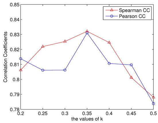 k set from 0.2 to 0.4, the correlation coefficients are higher than 0.8. However, when
