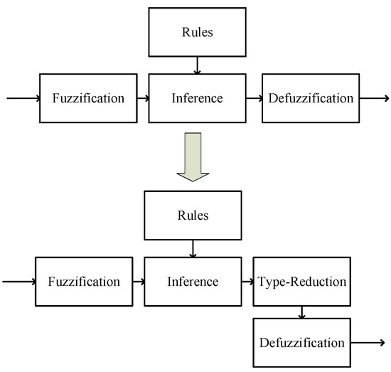 The main difference resides in the defuzzification; this process is very interesting because in Type-1 fuzzy inference systems it is realized by the centroid method, but in an IT2 FIS the process for defuzzification is realized by a new process called type-reduction. This process is significantly more complex than defuzzification and is explained in Section 3.