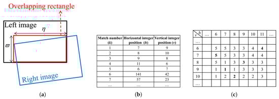Encoding scheme: (a) the overlapping rectangle, (b) an example list of some putative correspondences, which are identified by their indices, and their positions relative to the overlapping rectangle and (c) a part of the 2D lookup table constructed using Equation (6); the bold numbers show the indices of the original matches, and the regular numbers show the indices assigned to the other pixels.