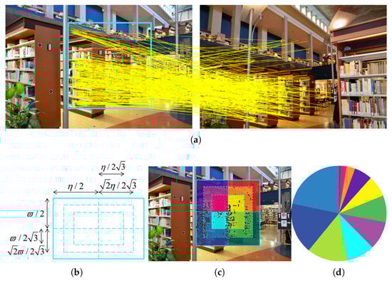 For the first half of the population, the 12 correspondences are picked up from the regions that are selected successively in a roulette-wheel selection. The density of a region determines its probability to participate in sampling. In simple words, the wheel is turned 12 times, and every time, a region is selected from which to draw a match. For the other half of the GA population, every individual is made of twelve correspondences in a way that at least one match is sampled from each region. The reason for introducing this two-step sampling is to avoid high-density regions having full dominance in the population. Figure 3c illustrates an example of putative correspondences distributed on the overlapping rectangle, and the roulette wheel corresponding to it is shown in Figure 3d. Once the population is formed, the correspondences of every sample set in the population should be substituted into Equation (2) to determine the fundamental matrix (F). Then, each fundamental matrix is evaluated using the cost function in Equation (5), and its fitness is decided; the lower the value of the cost function, the fitter the individual.