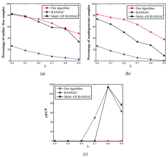 The proposed algorithm drew up to 75-times more outlier-free sample sets in comparison with RANSAC within a limited budget of 1000 sample sets (Figure 4a). The percentages of outlier-free samples for our algorithm and Multi-GS-RANSAC were very close. This showed that the Multi-GS sampling strategy performed well in the absence of degeneracy. However, Multi-GS sampling failed to draw non-degenerate sample sets as the ratio increased (Figure 4b). For ratios higher than , both RANSAC and Multi-GS-RANSAC failed to estimate the model correctly (Figure 4c), while the proposed algorithm estimated the model robustly even in the presence of serious degeneracy ().
