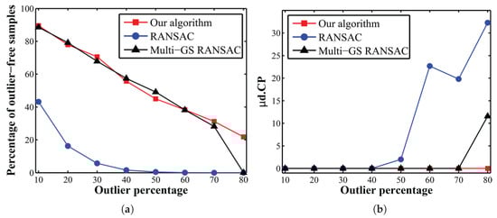 A similar test was performed to assess the performance of the sampling algorithm under various ratios of outliers. To this end, the Church dataset was used. The limited sampling budget was set to 1000 and 5000 sample sets for outlier rates less than or equal to 50% and higher than 50%, respectively. The percentage of outlier-free sample sets among the budgeted sample sets (either 1000 or 5000) and the estimation accuracy () are presented in Figure 5.