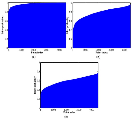 Inlier probability of correspondences obtained using (a) our adaptive thresholding method: (b) median-based algorithm; (c) covariance-based algorithm.