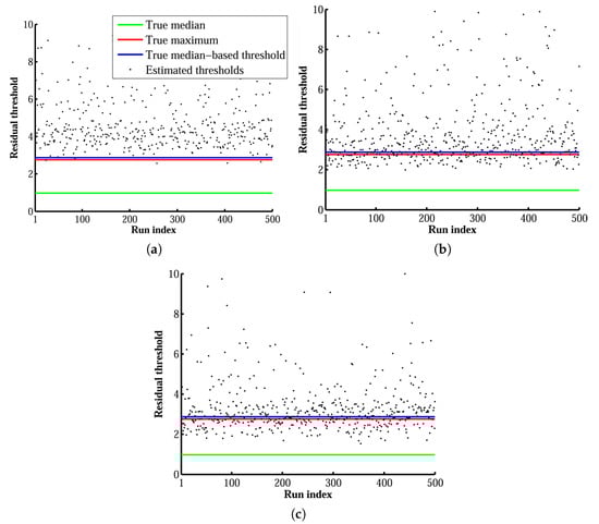 To investigate the reason behind the performance of each algorithm, the threshold values determined at each run are illustrated versus the run index as black points in Figure 7. Then, the true residuals, which are residuals of the matches from the true fundamental matrix, were calculated. Note that the true fundamental matrix is the one based on which the matches are synthesized. The maximum and the median of the true residuals are shown in Figure 7 as the red and green lines, respectively. Then, the parameter using true residuals was used to calculate the true median-based threshold. The blue line illustrates this value in Figure 7.