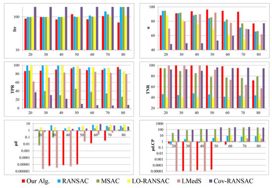 From the accuracy point of view, the proposed algorithm was more robust to outliers in comparison with other algorithms, especially when the outlier percentage grew over 40%. On average, the proposed technique achieved 91% ± 6% accuracy for inlier detection. The considerably high estimation accuracy (average of ) confirmed this, as well. The improvement obtained by the proposed algorithm was also evident regarding the true negative rate (average TNR of 94%), which showed the efficiency of the algorithm to distinguish outliers from inliers. Figure 8 also indicates that LMedS performs robustly for outlier ratios less than 50%. However, model estimation and, particularly, inlier detection for higher outlier rates is the bottleneck of this algorithm. The Cov-RANSAC resulted in better TNR compared to our algorithm. However, the spatial configuration and the level of noise in the sampled points are ignored in this method. As a result, the estimation of model uncertainty becomes impractically too large or too small. Consequently, the number of inliers is usually over- or under-estimated. That is why this technique resulted in very low TPR. .