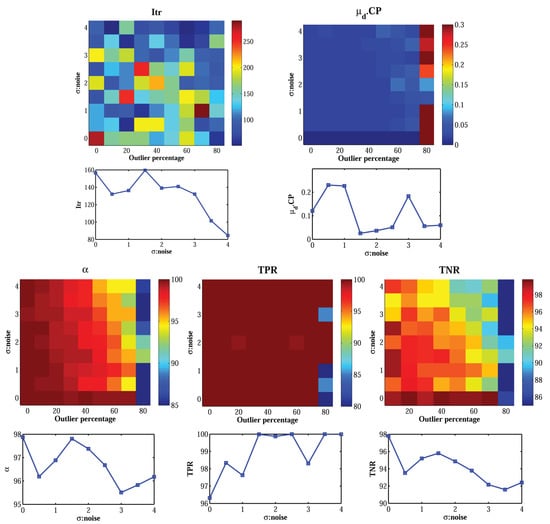 From the accuracy point of view, the accuracy of estimation (described by ) did not decrease by increasing the noise level. The different noise synthesized on putative matches varies between zero and four pixels. The robustness of the algorithm to noise means that the sample sets whose points have a lower level of noise can be recognized through the LTS-based objective function. Thus, the estimation of the fundamental matrix would be based on the least-noisy correspondences of the dataset. Regarding the accuracy of inlier detection, the true positive rate was not affected by the noise. However, the true negative rate decreased slightly by increasing the noise level. Since the outliers were synthesized by adding gross errors as low as 10 pixels to correspondences, distinguishing real outliers from noisy inliers at higher noise levels became a more difficult task, and the false positive rate increased. In terms of convergence speed, increasing the magnitude of image noise decreased the number of iterations. The total number of iterations required to find the final solution changed only from 80 to 250 as the ratio of outliers increased to 80% and the level of noise increased to four pixels. This shows the high computational efficiency of the overall algorithm in the presence of high ratios of outliers and noise.