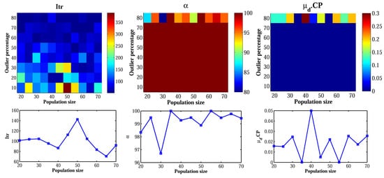 To evaluate the effect of GA population size on the performance of the algorithm, the Church dataset was applied. The GA population size was varied from 20 to 70 by steps of five individuals, and the performance of the algorithm was assessed under various outlier ratios. The results obtained from this experiment are illustrated in Figure 10.
