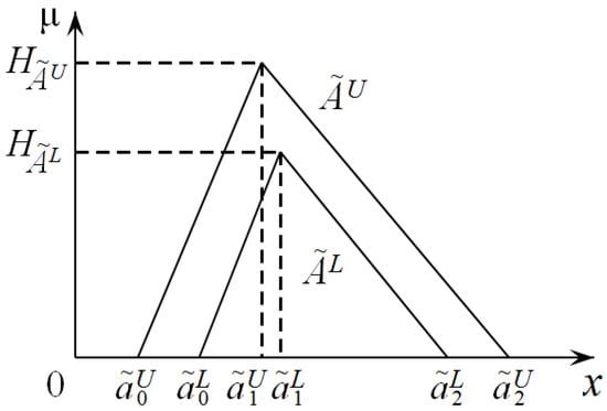 As indicated above, an interval type-2 fuzzy set can be represented by the LMF and the UMF , i.e., . In particular, when triangular membership functions are used, such an interval type-2 fuzzy set can be illustrated as shown in Figure 3, where , , and denote the three key points of the LMF and those of the UMF, respectively, and and denote the maximum membership values of and , with , , . Clearly, the closer the shapes of and are, the less uncertain the information contained within is. When coincides with , the interval type-2 fuzzy set degenerates to a type-1 fuzzy set.