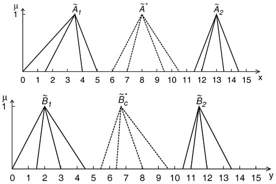 - Implement modified procedure:To obtain intuitive interpolated conclusions for interval type-2 fuzzy sets, the relative location between the LA and UA of an interval type-2 fuzzy set should be considered [39]. For this purpose, is modified into to maintain the relative location both before and after the scale transformation. Here, a relative location factor is defined by:where and denote the “new” terms, which are modified from the given and , respectively, using the same . The combined and of are then computed as the mean of the corresponding two terms, such that:Similarly, the final interpolated conclusion can also be modified from to using the same to maintain the relative location both before and after the move transformation.