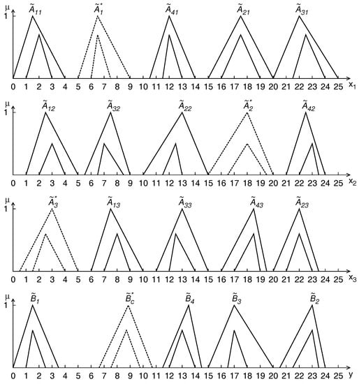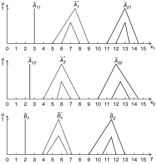 where denotes the j-th antecedent fuzzy set of rule , denotes the observed fuzzy set of variable and denotes the consequent fuzzy set of rule with , M being the number of antecedent variables.
