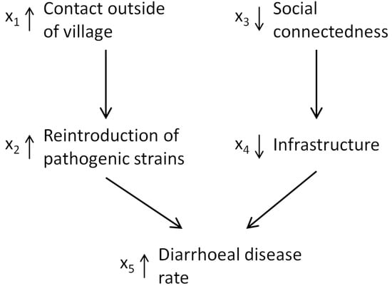 Environmental change influences disease burden [43,44]. Intensive studies have been made in an effort to identify logical relationships underlying such influences so that the consequences of a certain environmental change may be predicted. One particular application problem in this area has recently been investigated in [15,45], which is based on the study of [46]. The original problem of [15] is simplified such that all of the examined factors are linearly connected. The resulting simpler causal model is shown in Figure 8.