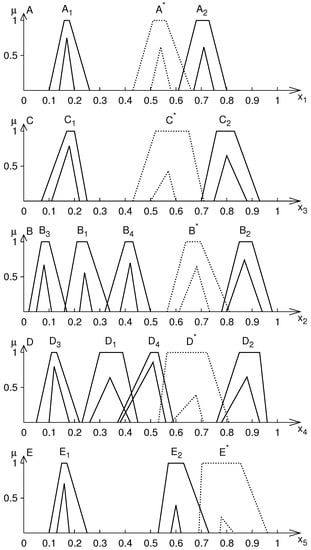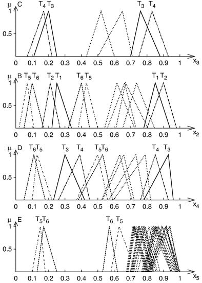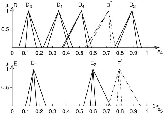 This example considers a specific case where all of the interval type-2 fuzzy sets degenerate to type-1 fuzzy sets, i.e., and . All of the terms are listed in Table 4, where the type-1 fuzzy sets are still represented in the form of interval type-2 fuzzy sets.