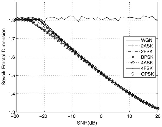 Sevcik fractal dimension of different kinds of signals. ASK: amplitude shift keying; FSK: frequency shift keying; QPSK: quadrature phase shift keying; WGN: white Gaussian noise.