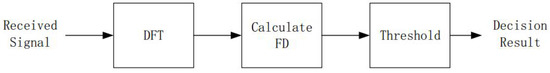 The SFD of the signal fluctuates little with the SNR, and it can be distinguished from the SFD of Gaussian white noise. Therefore, SFD can be used to distinguish the signal and noise. The block diagram of spectrum sensing system based on SFD in the frequency domain is shown in Figure 3. Firstly, the received primary user signal is transformed into the frequency domain by DFT, and then SFD is calculated.
