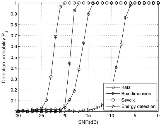 In Figure 5, we compare the detection probability of the proposed method with the Katz fractal dimension scheme (Katz), the box dimension method (Box dimension) and the energy detection algorithm. According to Figure 2, the noise fractal dimension is basically maintained, fluctuate around a mean value under different noise powers. Hence, the decision threshold can be determined by the value of the noise fractal dimension, and correspondingly the false alarm probability is a constant which is set as . The values of the threshold and the correction in different schemes are shown in Table 1.