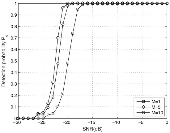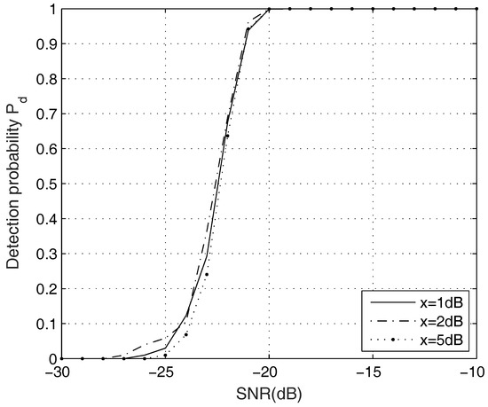 In Figure 8, the detection performance of the proposed algorithm is plotted when the noise uncertainty is 1 dB, 2 dB, and 5 dB, respectively. As expected, noise uncertainty had little impact on the detection performance of the proposed method, which means the proposed scheme is insensitive to noise uncertainty. Furthermore, even in the case of 5 dB noise uncertainty, the proposed scheme still obtains 100% detection probability when the SNR is greater than −20 dB, and it can achieve more than 90% detection probability when the SNR is greater than −21 dB. Therefore, the algorithm presented by this paper can not only be insensitive to noise uncertainty, but also achieve high detection performance at low SNR.