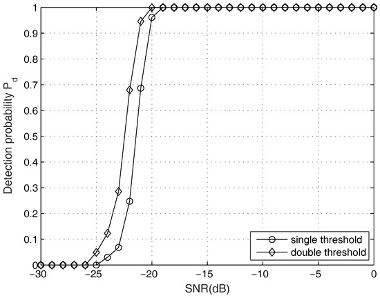 Figure 6 investigates the influence of the number of SUs on the detection performance when applying the proposed algorithm. We consider and let the average SNR at each secondary receiver be the same. As seen from the figure, the detection performance of the proposed scheme gets better when the number of cognitive users involved in collaborative sensing increases. We compare the detection performance of the proposed algorithm with that of the single threshold CSS algorithm based on SFD in Figure 7, where the threshold in the single threshold detection equals to the average noise SFD . The double-threshold method achieves 100% detection probability at −20 dB, which is 1 dB higher than that of the single threshold method. It can be demonstrated that the proposed approach benefits from higher detection performance compared with the single threshold CSS scheme based on SFD.
