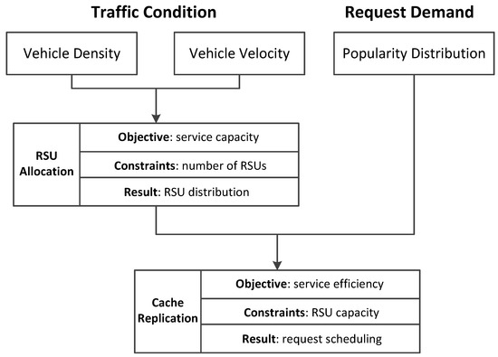 We present the details of the RSU scheduling strategy design procedures in Figure 2, including the RSU allocation and cache replication. Initially, we consider the dynamic environment with time-varying traffic conditions and various request demands. According to the traffic conditions, the RSU allocation strategy is designed to improve the service capacity with a limited number of RSUs. According to the RSU distribution and the popularity of the request demand, the cache replication is designed to improve the service efficiency with storage capacity constraint.