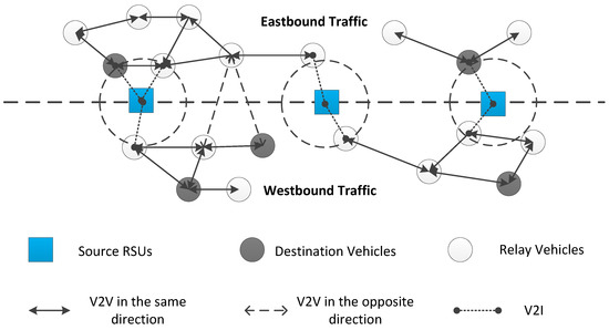Large-scale data dissemination, e.g., multimedia streaming applications, has become one of the major tasks of vehicular ad hoc networks (VANETs) [1]. Much effort is required to deal with some issues in vehicular environments, such as the fast changing topology, the shortened intermittent connectivity, the unique set of applications, and the harsh propagation conditions [2,3,4]. Such distinguishing features demand the design of new networking solutions [5,6].