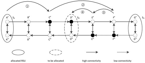 As the connectivity bottleneck in the upstream will reduce the whole link capacity, the main idea in Algorithm 1 is to arrange the connectivity bottleneck in the downstream of the communication link through RSU allocation. The details of implementation issues will be illustrated through an example in Figure 4. Given a bidirectional traffic flow, the RSUs are allocated in region A and G. In the link , there exist four connectivity bottleneck nodes denoted as black nodes with . We are motivated to maximize the link capacity through RSU allocation. Initially, the set of regions are available for RSU allocation. In step ①, is selected as the link bottleneck, and the link is updated as ; in step ②, is selected as the link bottleneck, and the link is updated as ; in step ③, is selected as the link bottleneck, and the link is updated as ; in step ④, is selected as the link bottleneck, and the link is updated as . Finally, as , the RSU is allocated in region D. As a result, can be divided into and with increasing link capacity and , respectively.