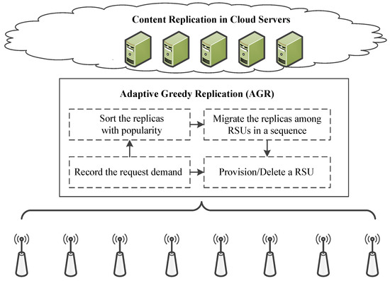 As we assume that the traffic flow would pass all the RSUs in a sequence along the road, the popularity distribution of replication content in cloud servers can be recorded in advance. The popularity list can be achieved for each replica, and the replicas can be migrated among the RSUs in a sequence. In the adaptive greedy replication strategy, the replica with the highest popularity in the current situation would be allocated in the RSU until the storage capacity is full. After each round of replication, the corresponding request demand of the vehicles can be served by this RSU when they pass by. This procedure is implemented at each RSU in a sequence until all of the request demands of the traffic flow are satisfied. Therefore, the replicas with high popularity would be allocated at the head of the RSU sequence, and the ones with low popularity are allocated at the end of the RSU sequence. During practical implementation, the replicas in the sequence of RSUs can be migrated adaptively to adjust with time-varying request demands. According to the request demands, the adaptive greedy replication strategy can start a new RSU or terminate an old RSU at the tail of the sequence. In other words, our proposed greedy algorithm is straightforward enough to allocate the most popular replicas in priority, and adaptively redirect the request demands towards these RSUs to maximize the service time.