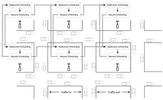 In order to deal with a general case scenario with dynamic traffic flow in global urban areas, we present a distributed online scheduling strategy for a general case scenario in Figure 7, in which the vehicle may enter or leave the road at anytime and anywhere as a traffic-in or traffic-out. Each RSU can monitor the traffic flow and request demand in its local coverage areas, and the statistic information is only shared among neighbor RSUs for cooperation. Accordingly, the distributed online scheduling strategy includes a request scheduling mechanism for the transmission layer mapping, and a replication scheduling mechanism for the replication layer mapping, respectively.