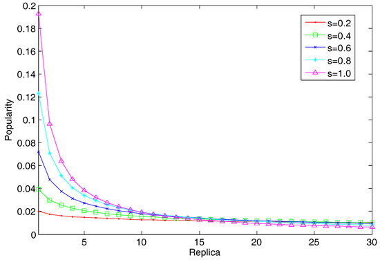 Furthermore, we assume 1000 different content replicas with Zipf distribution to simulate the various request demands. The popularity (or request rate) of the i-th replica is . The value of parameter s is usually in the range of , according to previous application services. Here, we can consider different skewness to simulate popularity distribution of replicas. We present the popularity distribution of the top-30 replicas with different parameter s setup in Figure 8. Without loss of generality, each RSU has a uniform storage capacity for content replication.